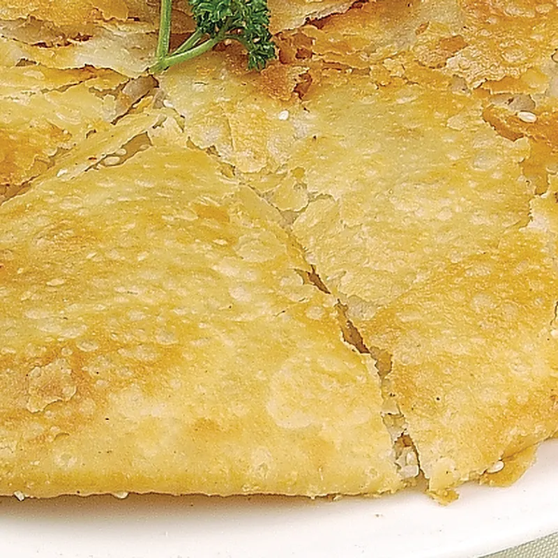 3、不粘锅上火,放入黄油,将薄饼用擀杖挑起放入锅中,用中火煎至两面金黄,外壳发硬时取出,然后用双手握住圆饼。向中间挤压,再片片撕开,装盘即可。