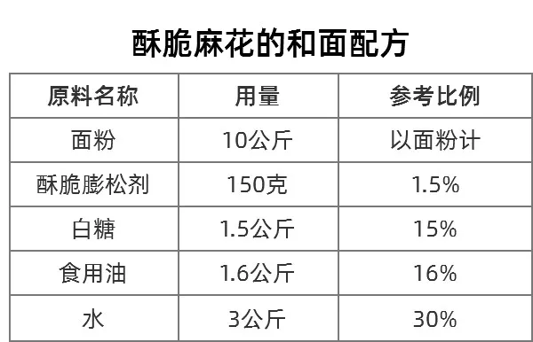 炸麻花使用酥脆泡打粉的方法很简单,只需把酥脆泡打粉加在面粉适当混合,然后和面即可,不需要改变原有做麻花的工艺。